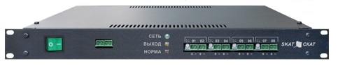 19",1U, 8 выхода по 0,5 А или 4выходов по 1 А. Плавная регулировка выходного напряжения, максимальный ток по всем выходам 4,5 А, внешние АКБ 2 шт. 26 Ач; 2 информационных выходов о состоянии источника.Характеристики SKAT V.8 Rack
