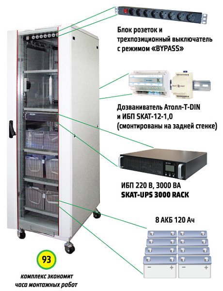 Комплекс бесперебойного питания 220В/3000 ВА, чистый синус, on-line, диапазон входного напряжения 165-290 В, 19" шкаф, место под доп. оборудование, место под 8шт. АКБ 120 АЧ ( в комплект не входят), телефонный информатор о состоянии сети.Характеристики SKAT UPS 3000