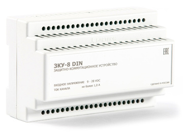 Защитно-коммутационное устройство для коммутации и защиты от КЗ линии питания 9—28 В, 8 каналов по 1 А; быстроразъемные клеммы для удобства монтажа; самовосстанавливающиеся предохранители в каждом канале, индикация по каждому каналу. Малогабаритный корпус на DIN-рейкуПри использовании проводов большой протяженности и малого сечения на выходе линии мы получаем реальное напряжение, которое может оказаться непригодным для питания тех или иных приборов, может возникнуть ситуация, когда, например, при коротком замыкании (КЗ) в конце такого длинного шлейфа питания не произойдет перегорания выходного предохранителя источника питания. При этом источник будет работать, в основном, на нагрев провода. Этими причинами объясняется нецелесообразность разводки питания извещателей и прочих приборов ОПС с помощью индивидуальных длинных проводов малого сечения. Более того, если от ИВЭПРа отходит разветвленная шина питания, то весьма затруднительно определить, в какой именно ветви шины произошло КЗ.